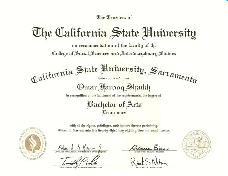 I have a Bachelors Degree in Economics from the California State University of Sacramento (CSUS) .